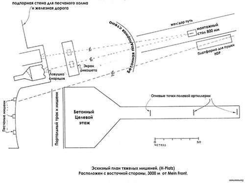Любая попытка описать величину мишени затруднена. Есть 3 радиальные линии огневых позиций. Восточная линия, стреляющая в восточную мишень, состоит из козлового крана и несет платформу и крепление для 80-сантиметровой пушки. Западная линия оснащена пробными дугами для полевой артиллерии. Между ними расположено крепление и детали крепления для 150 мм гладкоствольного пушки (HDP).